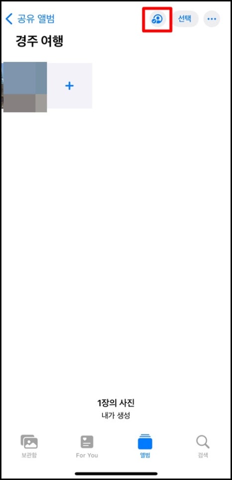7. 만약 중간에 공유앨범 초대를 원한다면 상단 프로필 모양 아이콘을 선택해 주세요.