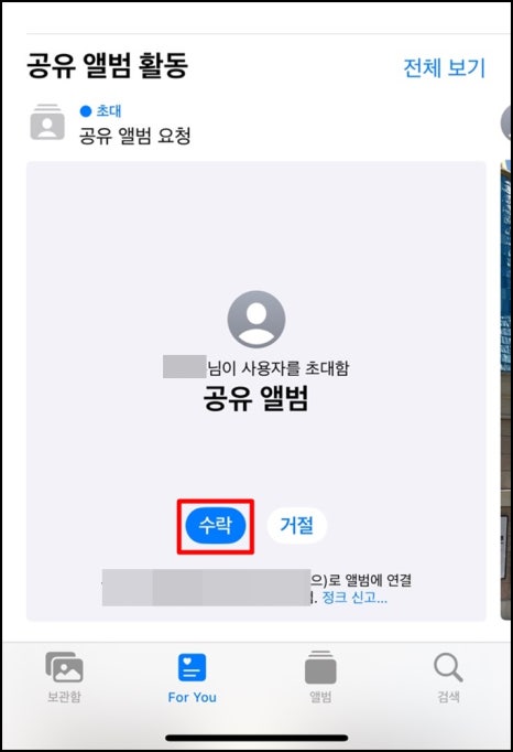 만약 다른 사람이 나를 초대했다면 수락하는 방법도 알아두는 게 편하겠죠? 버튼 몇 번만 누르면 바로 사진을 공유할 수 있어요.