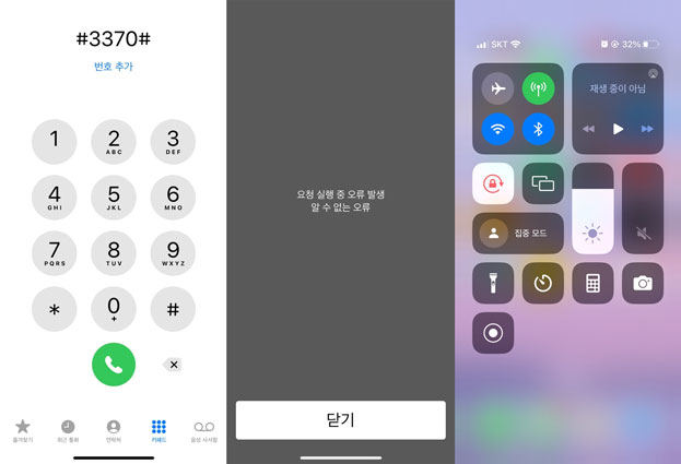 아이폰 키 패드 > #3370# 입력 후 통화 버튼> 오류 라는 문구가 나오면 닫기