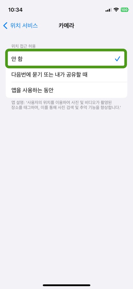 이 때 위치정보 옵션을 '사용 안함'으로 해주면 위치정보를 기록하지 않고 배터리도 세이브 할 수 있다.
