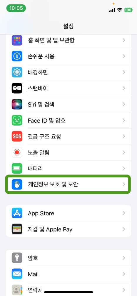 1. 설정 > 개인정보 보호 및 보안을 터치한다.