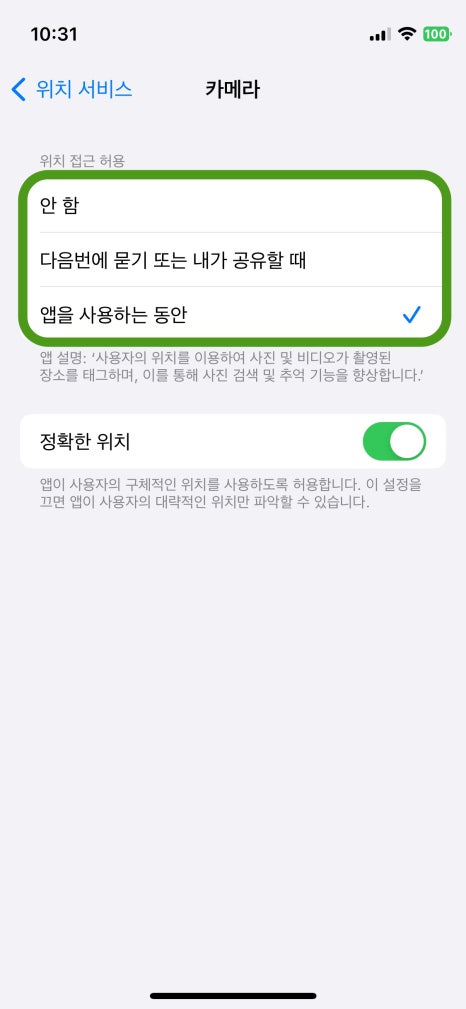 이 옵션은 말 그대로 앱을 사용할 때만 GPS를 가동하므로 배터리 사용을 최적화 할 수 있다.