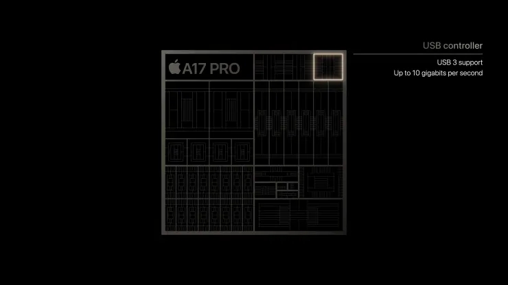A17 Pro에는 전용 AV1 디코더가 탑재되어 있어 스트리밍 서비스의 효율과 영상 품질이 한층 높아진다. 또, 새로운 USB 컨트롤러로 iPhone은 사상 최초로 USB 3 속도를 갖추게 되어 전송 속도가 훨씬 빨라지고, 영상 출력을 최대 4K의 초당 60 프레임 HDR까지 지원한다.