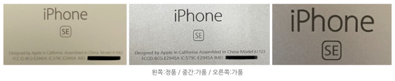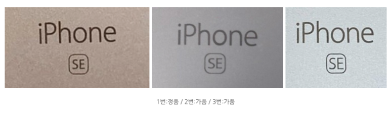 순정품과 호환품의 뒤판은 'IPhone SE' 글자의 크기와 굵기 여백에서 차이를 보인다.