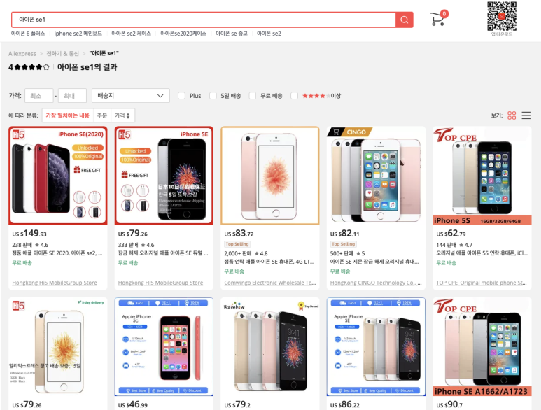 알리 익스프레스에 '아이폰 se1'을 검색하면 아이폰을 판매 중인 셀러가 많다.