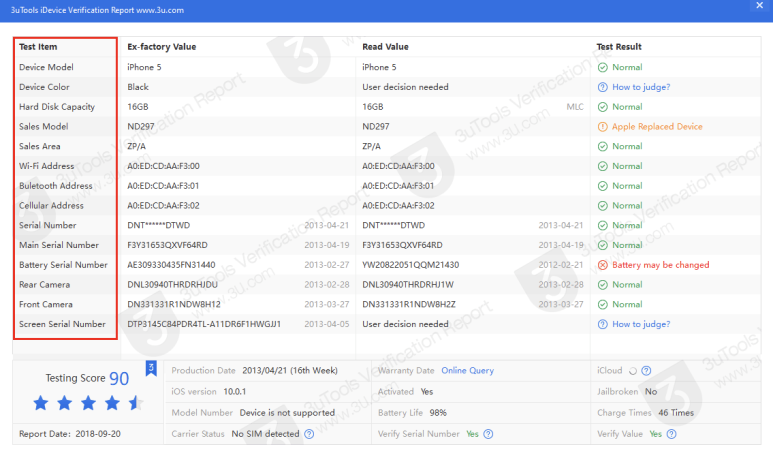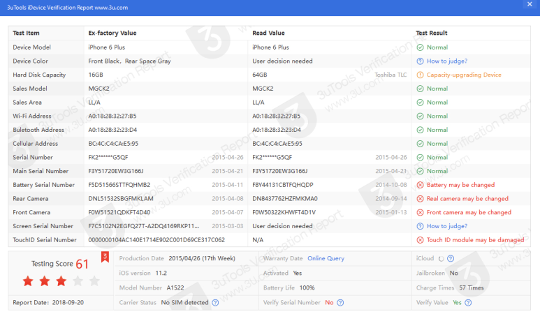 판매자에게 3utools의 실행 값을 요청하거나 판매글에 명시된 판매 연도와 IMEI 넘버를 비교하여 사실 여부를 확인할 수 있다.