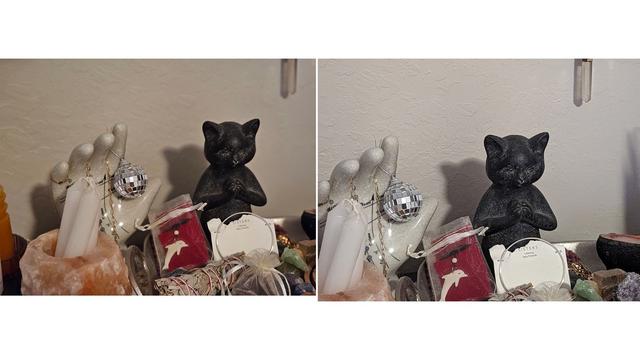 Google의 밝기 향상 알고리즘은 옥내 인공 광으로 찍을 때 가장 제대로 나옵니다. 이 사진은 침실 천장 라이트를 켜고 포트레이트 모드로 찍은 것입니다. 저는 S23 Ultra(좌) 가 분위기 있게 느껴졌고 희게 나온 Pixel 7 Pro(우) 사진보다 더 좋았습니다. Pixel은 사진의 샤프니스도 너무 올라가 고양이 뒤 편의 벽 디테일까지 확실히 보이는 게 오히려 싫었습니다.