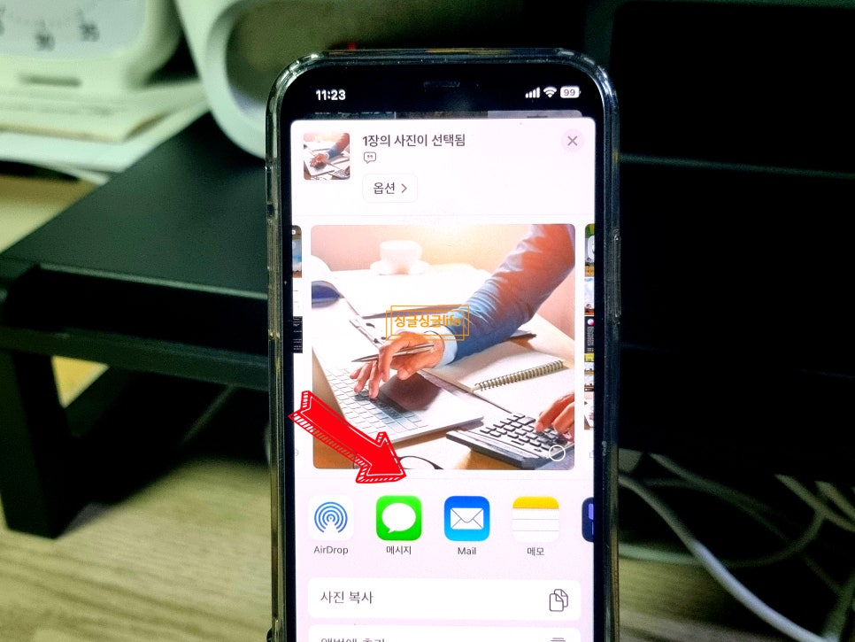 1. 사진 앱에서 이동하기 원하는 사진을 선택 후 공유를 선택합니다.