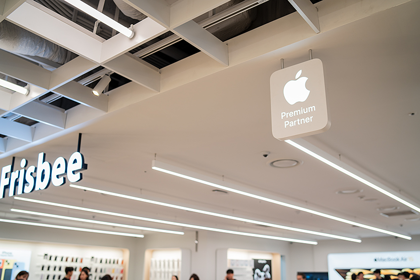 엘리베이터를 타고 8층으로 쭈욱 올라오면 되는데 트랜디한 패션 매장들이 몰려있는 곳이죠. 멀리서 보더라도 프리스비 로고를 쉽게 볼 수 있고 곳곳을 둘러보면 애플스토어의 느낌이 곳곳에서 뭍어나는 것을 경험할 수 있습니다. 아이폰, 아이패드, 맥, 액세서리 등 다양한 존으로 구분되어 있고 통유리의 느낌이나 전체적인 인테리어까지 편안함이 좋았습니다.