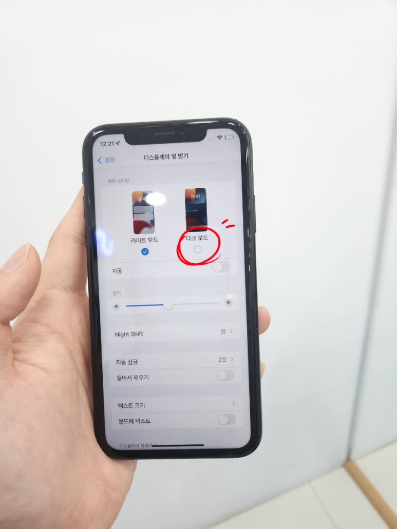 다음으로 [설정] → [디스플레이 및 밝기] → [다크 모드] 를 활성화하여 전력 손실을 최소화 해준다.