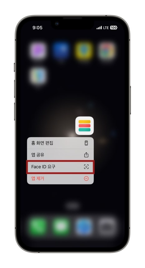 업데이트를 마쳤다면 아이폰 앱 잠금은 정말 쉽게 할 수 있습니다. 본인이 잠그고 싶은 앱을 찾았다면 해당 앱을 꾹 눌러주세요. iOS 업데이트를 했다면 새로운 기능인 Face ID 요구라는 기능이 보이는데요 이를 눌러주시면 페이스아이디 인증 후 앱이 잠기게 됩니다.