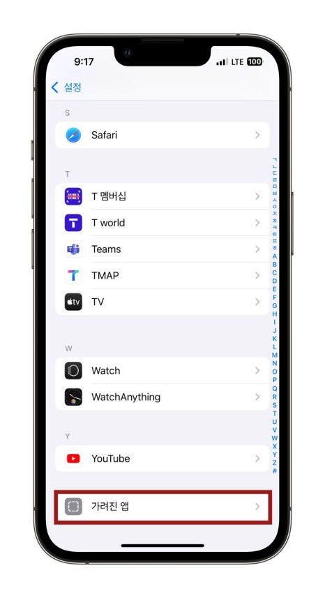 혹은 아이폰 홈화면에서 설정을 눌러주신 후 스크롤을 끝까지 내려보면 앱이라는 항목이 보이는데 이를 터치해주신 후 가려진 앱을 눌러보면 마찬가지로 페이스아이디 인증 후 가려진 앱의 목록을 확인할 수 있습니다.