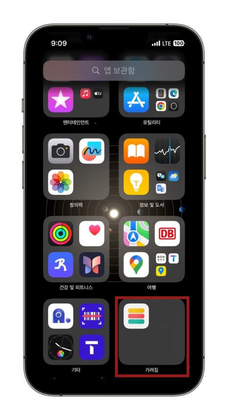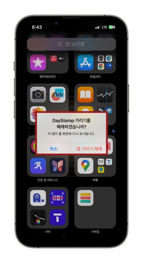 이렇게 가려진 앱은 앱 보관함 가장 우측 하단에 위치한 가려짐이라는 곳에서 페이스아이디를 인증한 후 확인할 수 있습니다.