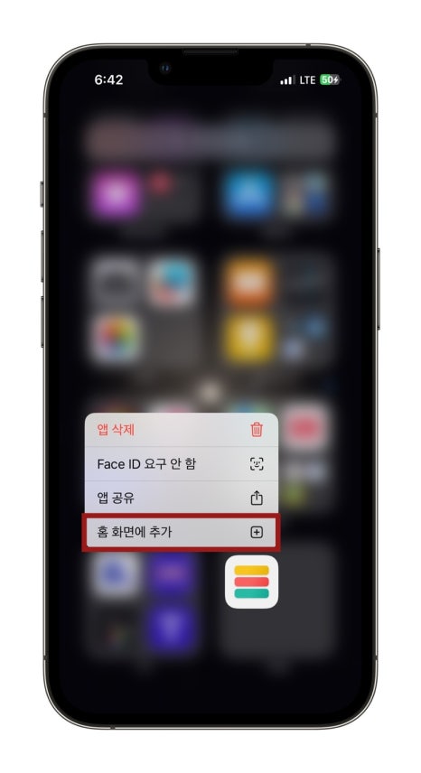 특정 앱을 잠그는 것에 더해 홈화면에서 보이지 않게끔 가리기 설정도 가능해졌습니다. 다시 한 번 가리고자 하는 앱을 꾹 누르신 후 Face ID 요구를 눌러보시면 가리기 및 Face ID 요구라는 기능도 보입니다. 이를 누른 후 나타나는 화면에서 앱 가리기를 터치해보면 홈화면에서 해당 앱이 사라지는 것을 확인할 수 있습니다.