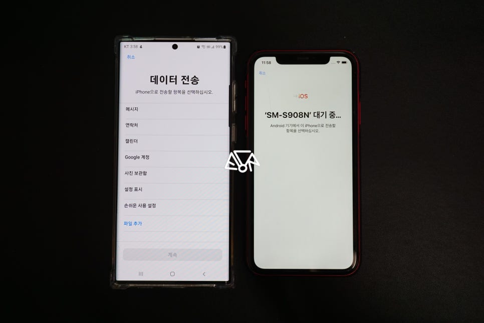 아이폰에서는 갤럭시 기기 명칭, 갤럭시 화면에서는 데이터 전송 화면이 보인다면 바로 이전 사용하던 갤럭시 데이터 옮기기를 할 수 있습니다. 다시 한번 말씀드리지만 두 휴대폰 모두 안정된 와이파이 환경 접속 내에서 진행해 주세요.