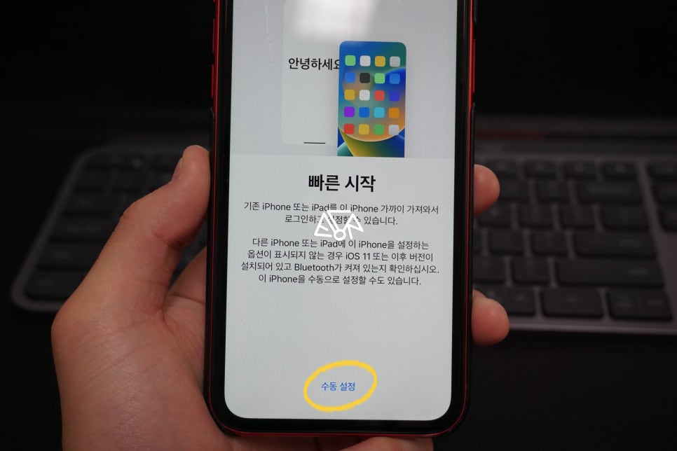 처음 안녕하세요 문구 화면을 넘겨, 언어 및 국가 설정을 먼저 진행해 주시면 바로 갤럭시에서 아이폰으로 이동할 수 있는 빠른 시작 화면이 보이는데요. 여기서 하단 작은 문구 '수동 설정'을 눌러 갤럭시 데이터 옮기기를 진행하겠습니다.