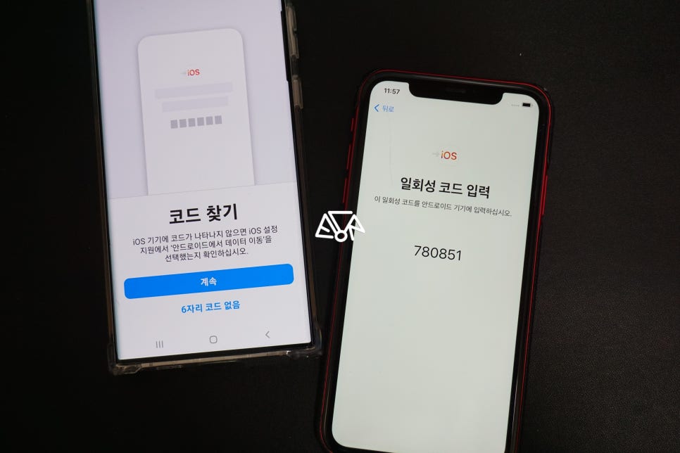 갤럭시에서 아이폰 이동을 위해 다운받은 iOS로 이동 앱을 실행하면 바로 아이폰에 보이는 6자리 일회성 코드를 그대로 갤럭시 코드 입력란에 타이핑하면 연결이 됩니다.