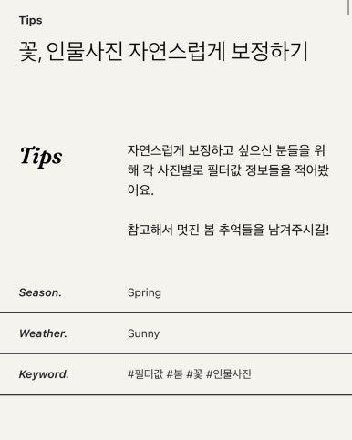 그리고 어떻데 필터를 사용했는지, 잘 찍는 방법에 대해서도 중간에 나타나서 살펴볼 수가 있다.