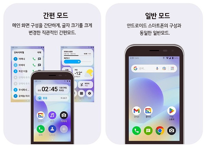 주요기능을 간단하게 사용하고 싶은 경우 간편모드로 , 일반적인 스마트폰처럼