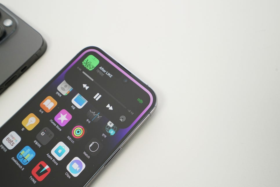 이러한 프로 시리즈의 차별점 중에 하나는 바로 다이나믹 아일랜드 기능입니다. 이 기능은 유저와 아이폰이 상호작용할 수 있는 새로운 UI로 음악을 켜게 되면 음악 재생 플레이가 뜨게 되고, 이 부분을 길게 눌러서 컨트롤할 수 있고, 타이머 등과 함께 두 가지 앱을 사용할 수도 있으며, 전화가 오면 전화를 받을 수도 있습니다.
