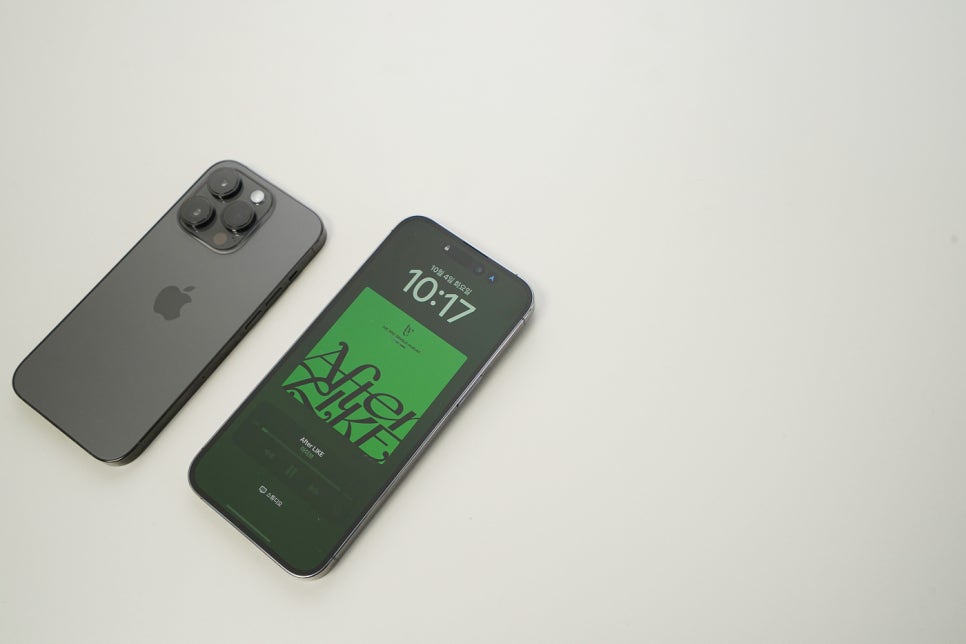 아이폰14 Pro 시리즈의 또 하나의 특징은 바로 상시 표시형 디스플레이입니다. 위 두 사진으로 보시는 것처럼 화면을 꺼지지 않게 사용할 수 있습니다. 일반 잠금 화면에서도 이 기능은 마음에 들지만 특히 iOS16에서 앨범 커버가 크게 보이기 사용할 수 있기 때문에 음악을 들을 때 특히 마음에 드는 기능이었습니다.