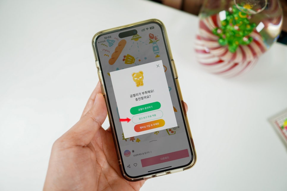 원하는 항목을 선택하고 '다운로드' 버튼을 누르면 곰젤리가 부족해 내려받을 수 없다는 팝업이 뜹니다. 이때는 광고 보고 무료 적용을 눌러 문제를 해결할 수 있으니 걱정하지 않아도 됩니다.