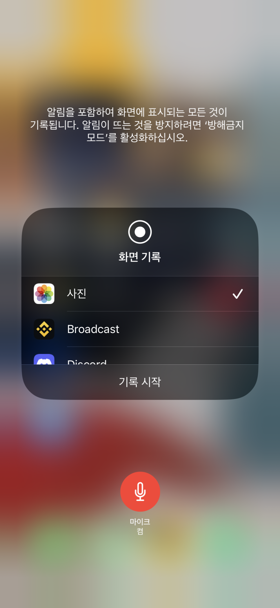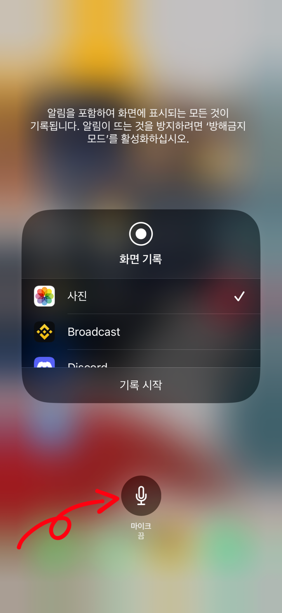 아이폰 화면 녹화 시 외부 소리를 함께 담고 싶다면 기록 버튼을 길게 눌러보자.