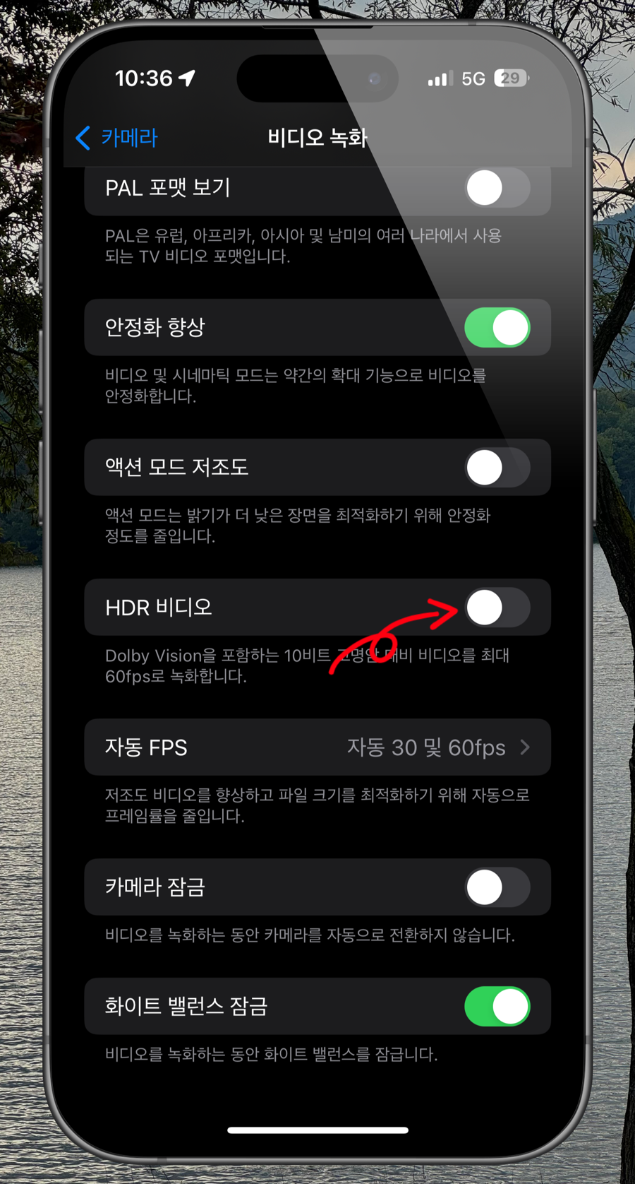 HDR 비디오를 우측에 있는 버튼을 비활성화해주시면 끝입니다. 그럼 이제 어떤 점이 달라졌는지 확인해 보겠습니다.