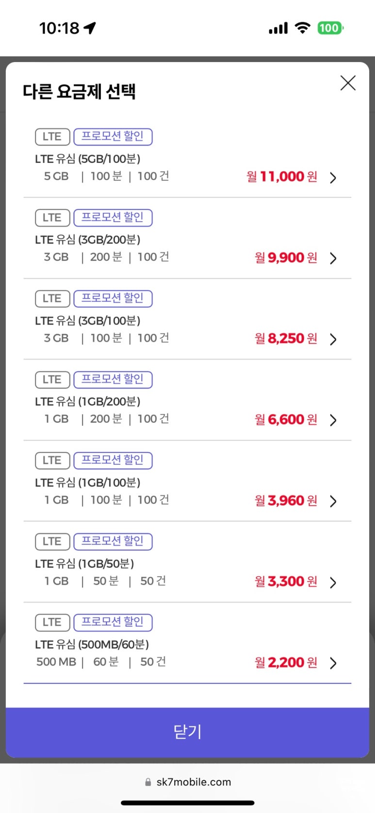 다행이 sk7모바일은 가격이 같아요