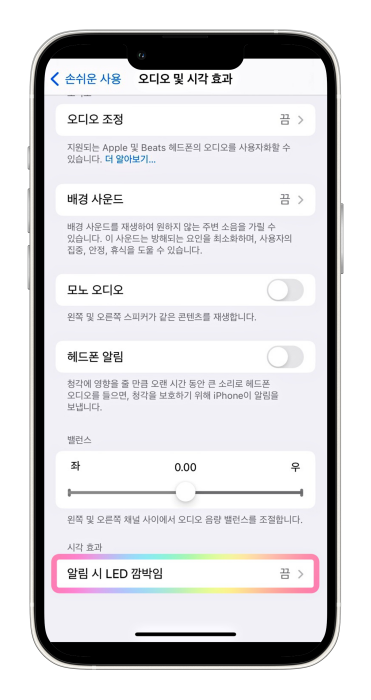 들어가면 다시 밑으로 스크롤을 하여 "알림 시 LED 깜빡임"에 들어갑니다.