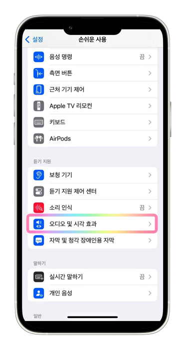 이후 "오디오 및 시각효과"에 들어가 줍니다. 이 버튼은 설정 아래로 스크롤을 해야 나옵니다.