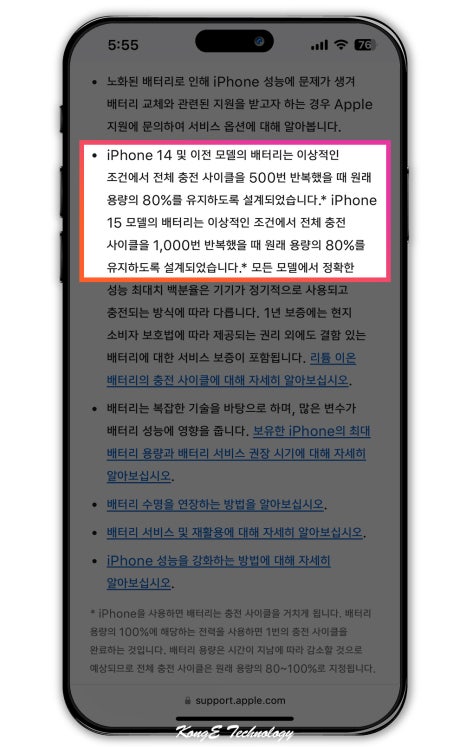 여러분도 알다시피, 배터리는 소모품이기 때문에 사용 기간이 길어질수록 성능 역시 자연스럽게 노화되기 마련입니다. 이는 대략 500번 정도 충전하면 발생할 수 있는 현상으로 크게 걱정할 필요는 없습니다.