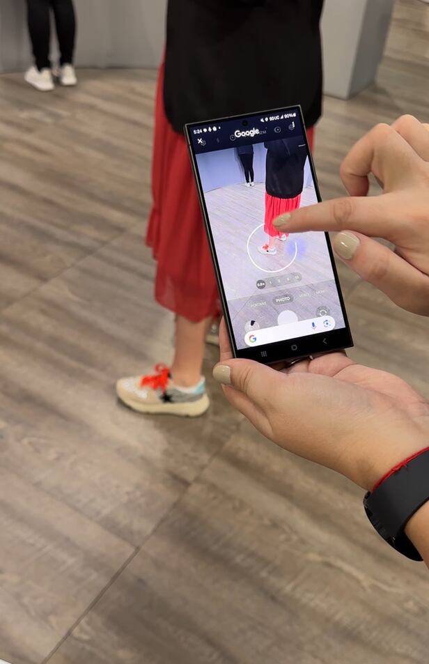 17일(현지 시각) 미국 새너제이에서 공개된 삼성전자 갤럭시 S24에 탑재된 '서클 투 서치' 기능을 활용해 행인이 신고 있는 신발 정보를 검색하는 모습./실리콘밸리=오로라 특파원
