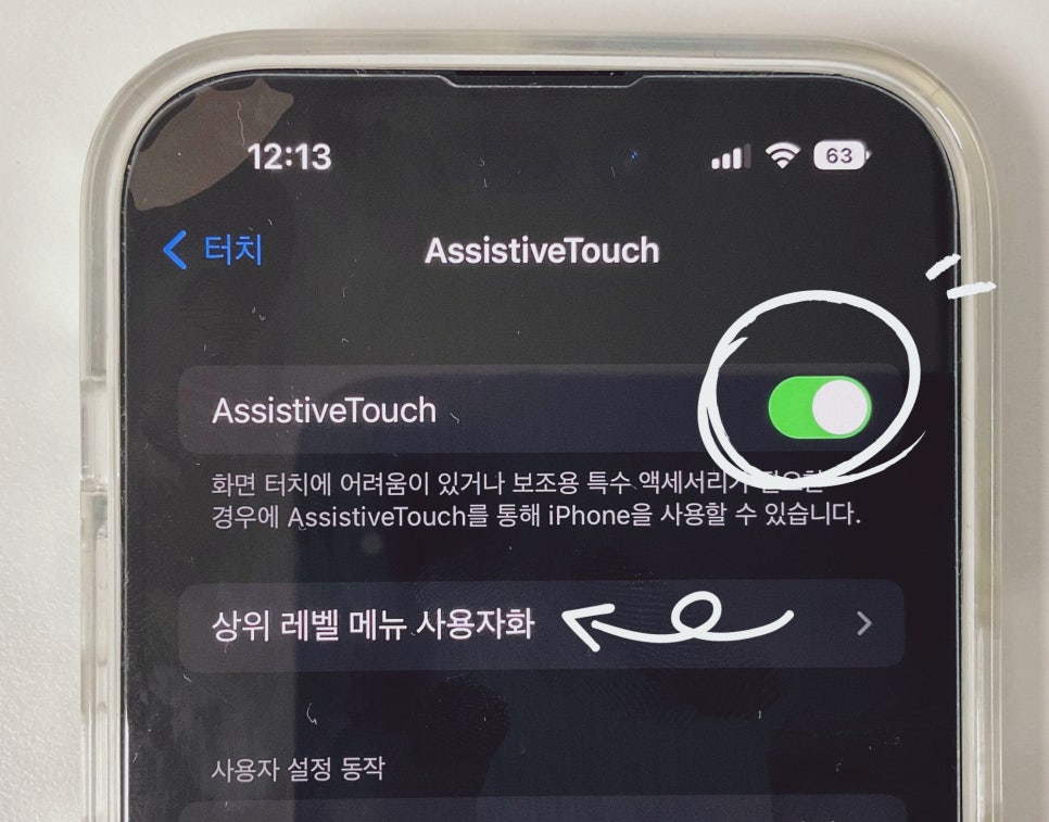 2. 터치 메뉴에서 AssistiveTouch를 선택한 뒤 AssistiveTouch 버튼 활성화합니다. AssistiveTouch 메뉴에서 상위 레벨 메뉴 사용자화를 선택합니다.