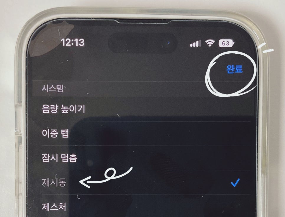 AssistiveTouch 버튼을 활성화하고 재시동 아이콘을 설정하는 방법입니다. 이 방법은 화면 멈춤이나 무응답인 상황이 아니라 재시동이 필요한 경우 선택적으로 이용할 수 있는 재부팅 방법입니다.