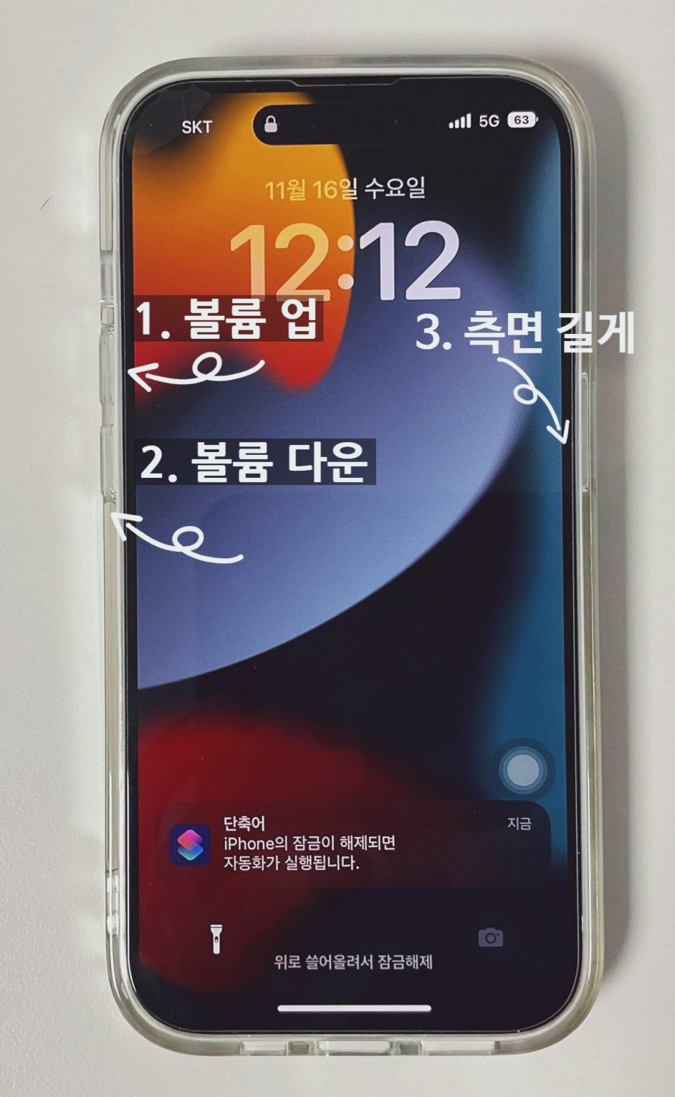 1. 아이폰 왼쪽 볼륨업 또는 볼륨다운 버튼 둘 중 하나와 오른쪽 전원 버튼을 동시에 2초 이상 꾹 누릅니다.