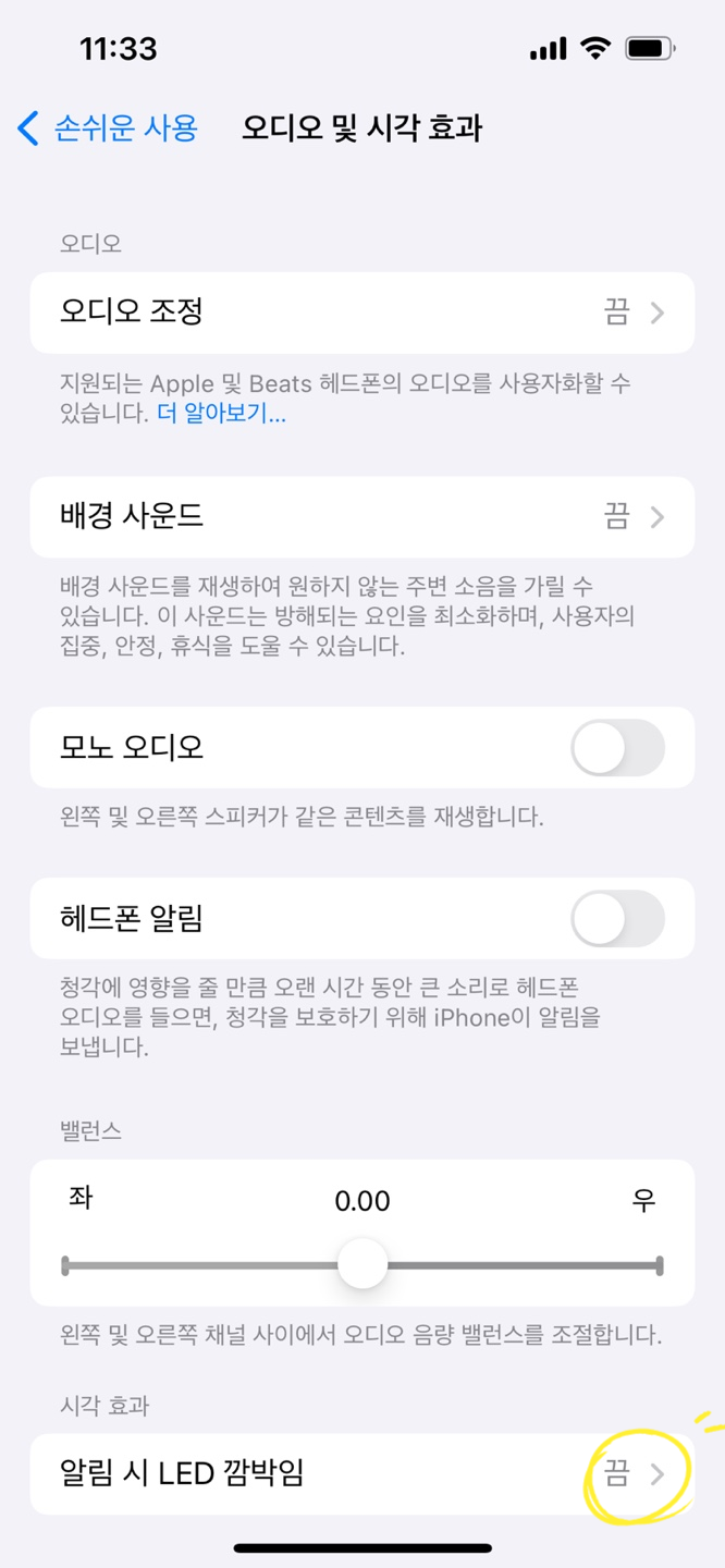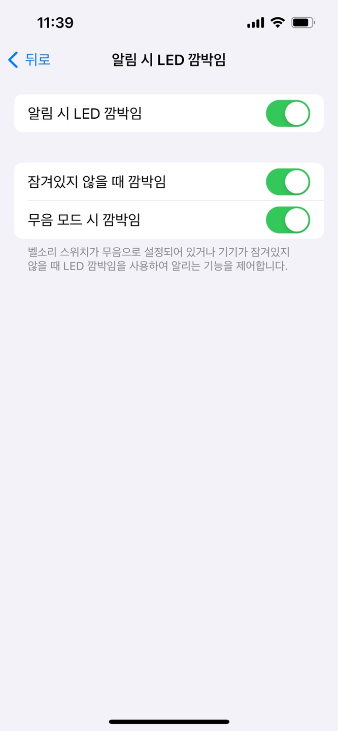 알림 시 LED 깜빡임 활성화: 맨 아래에 있는 '알림 시 LED 깜빡임' 옵션을 찾아 현재 '끔'으로 설정되어 있는 버튼을 '켬'으로 전환해야 합니다.