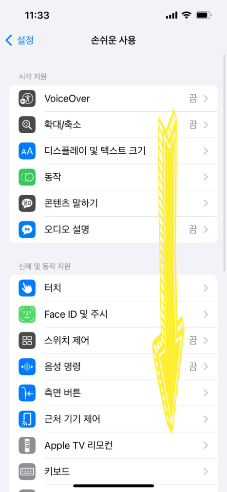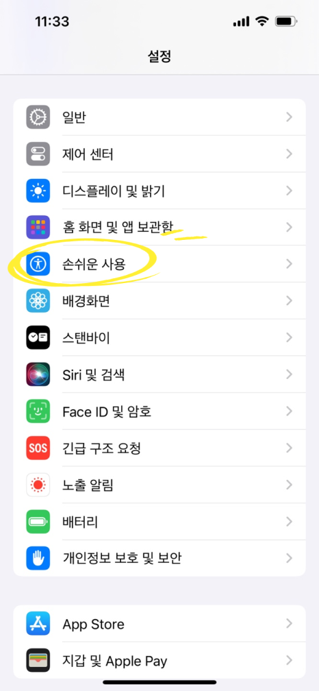 손쉬운 사용 설정으로 이동: 아이폰 설정 앱을 열고, 화면을 살짝 아래로 내려 '손쉬운 사용' 탭을 찾아 클릭합니다.