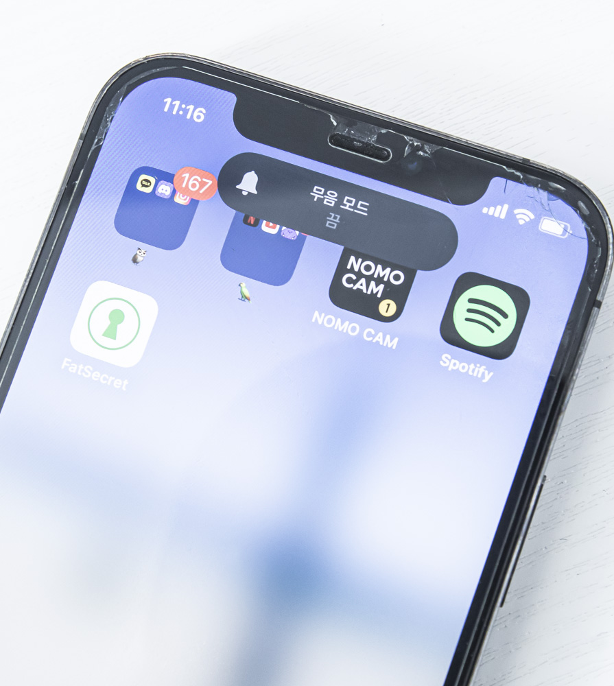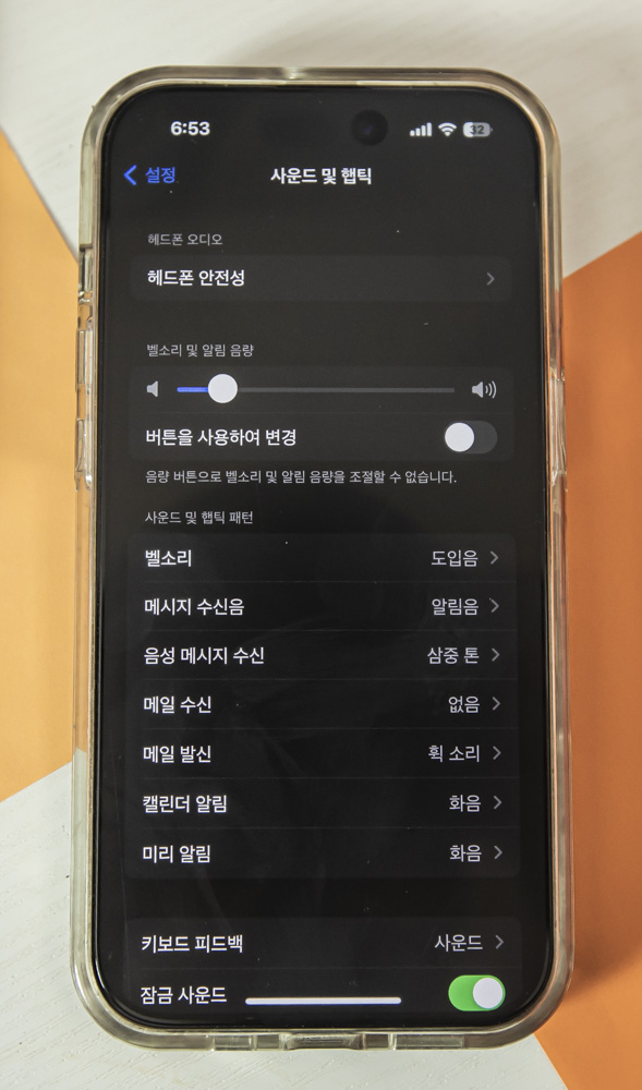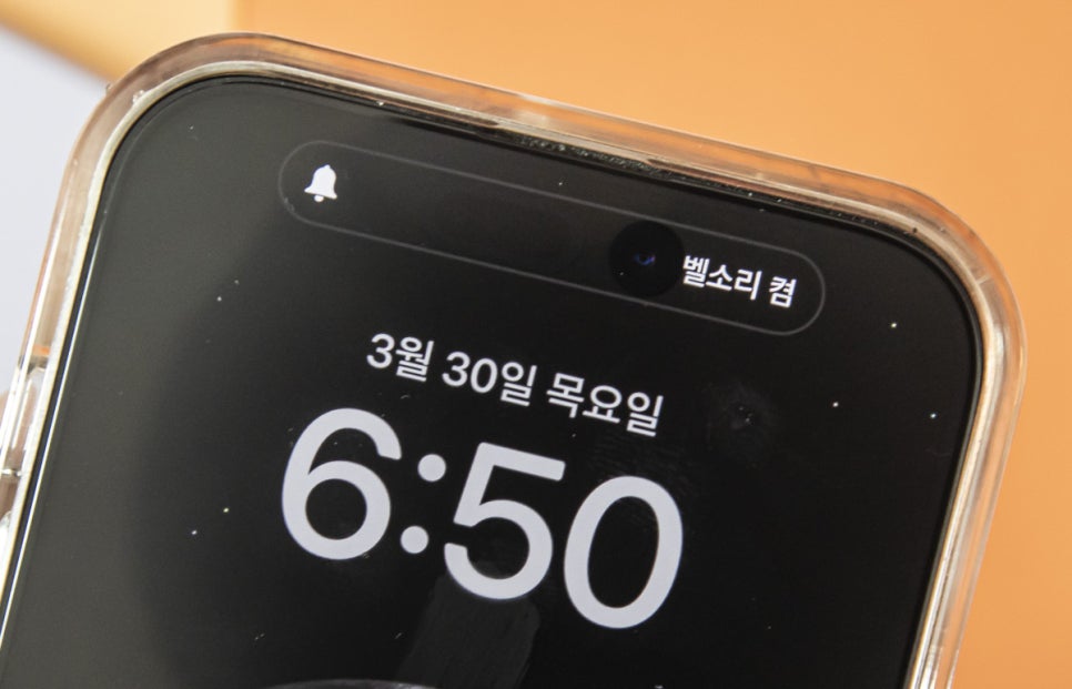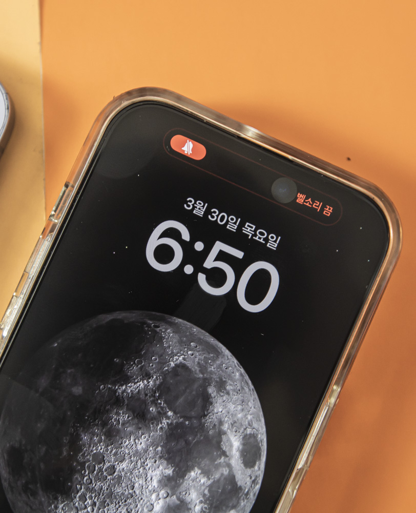 벽면에 물리적 버튼을 위로 올려 빨간색이 보이지 않게 되면 아이폰14 프로에서는 '벨소리 켬'이라고 나오지만...