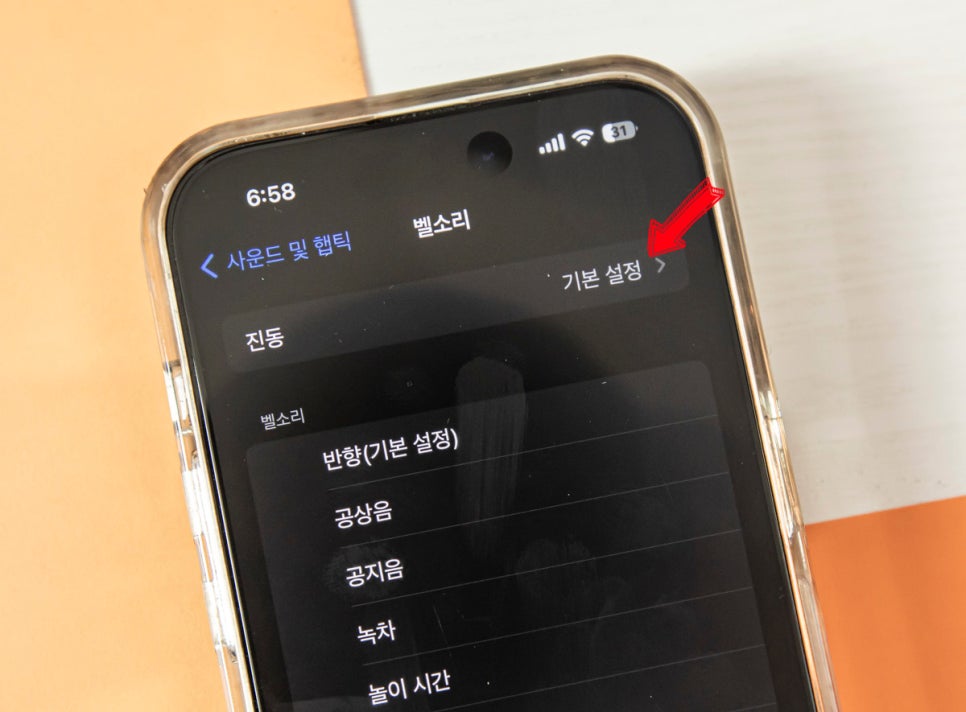 아래 사진처럼 '벨소리 모드에서 햅틱 재생'을 꺼두었습니다.