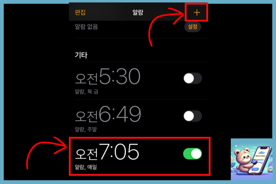 다음은 알람을 새로 만들기 위해 오른쪽 위 플러스(+)를 선택하거나, 기존에 사용 중인 알람 설정을 선택해 줍니다.