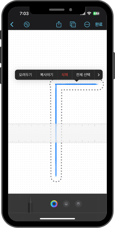 가장먼저 스케치 기능을 사용해 보았습니다. 다양한 필기구 와 지우개,자, 선택펜? 등이 있었습니다. 저는 자를 활용해서 'ㄱ' 자를 스케치 해보았습니다.