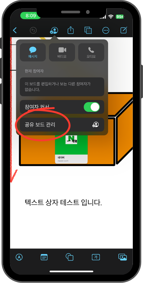 이때, 공유 아이콘 왼편에 사람아이콘이 하나 표시되는데요. 이 메뉴에서 공유보드 관리에 들어가셔서 초대받은 사람에게 편집권한을 부여해야합니다.