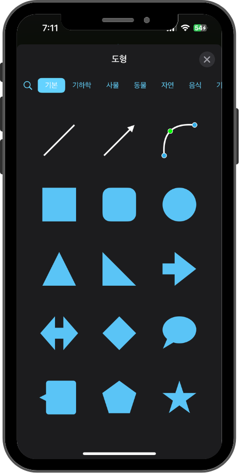 도형기능에서는 다양한 도형을 보드에 추가할 수 있는데요. 기본적인 도형 뿐만아니라 기하학,사물,동물,자연 등 생각보다 더 다양한 도형을 추가할 수 있다는 점에 살짝 놀랐습니다.
