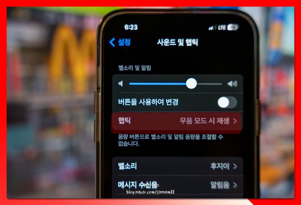 3. 여기서, 말하는 <햅틱>이란 우리가 흔히 알고 있는 진동을 뜻하는 건데요. 기본 설정은 무음모드 시 재생으로 되어 있을겁니다.