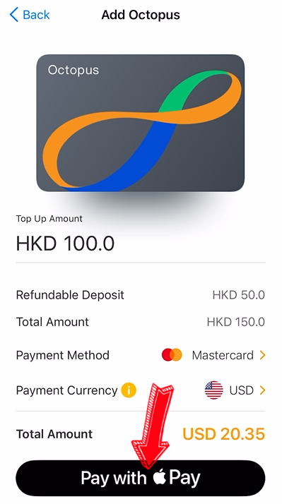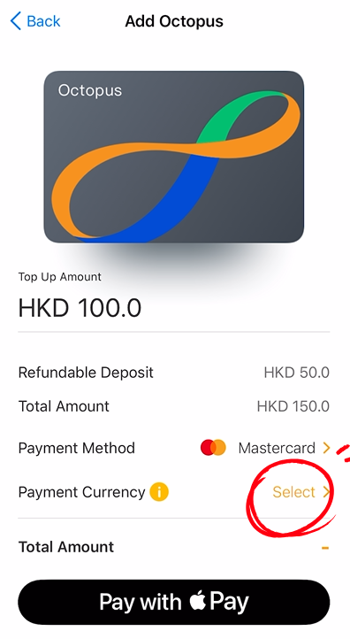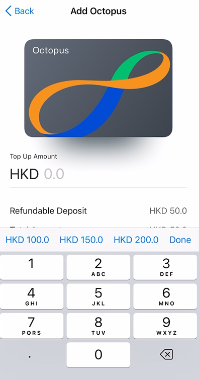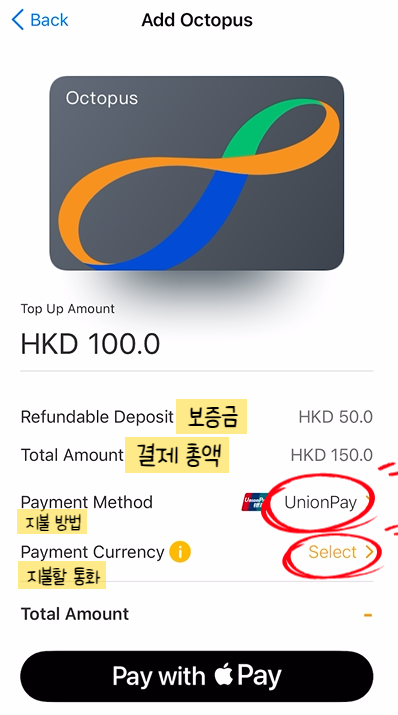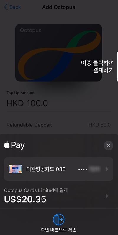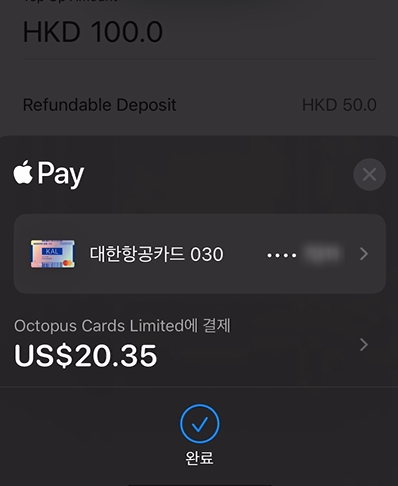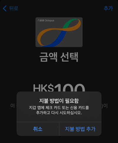 실물 카드 없이 옥토퍼스카드 애플페이 지갑에 추가하려면 무조건 HKD100 이상 충전해야 하기 때문에 애플페이 사용자만 가능합니다.