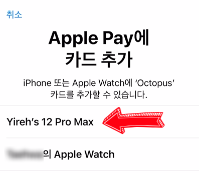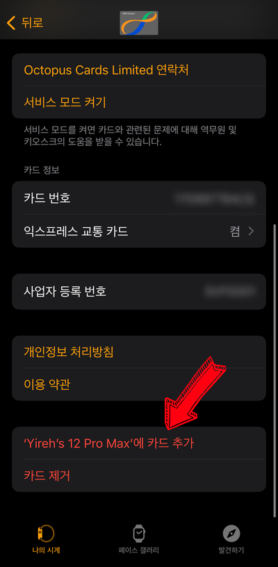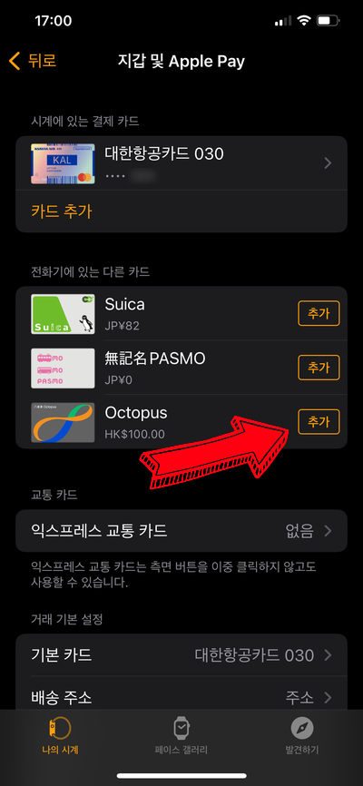 아이폰의 Watch 앱 - 지갑 및 Apple Pay로 들어갑니다. 여기서 Octopus를 누릅니다.