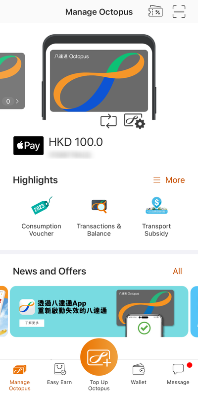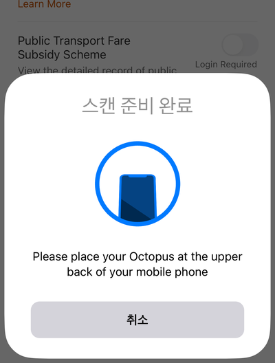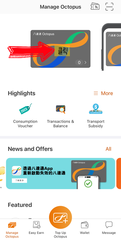 아래 화면은 Octopus 八達通라는 옥토퍼스카드 앱입니다. 아무것도 안 했는데 카드가 자동으로 연동 돼 있어요.