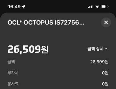 제가 결제할 당시 환율은 홍콩 169.5/ 미국 1,321이었어요. 한화로는 26,509원이 결제됐어요.