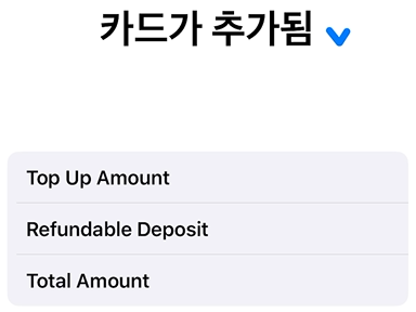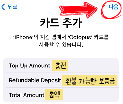 결제가 완료되면 옥토퍼스카드 애플페이에 카드 추가 화면이 나옵니다. ▼